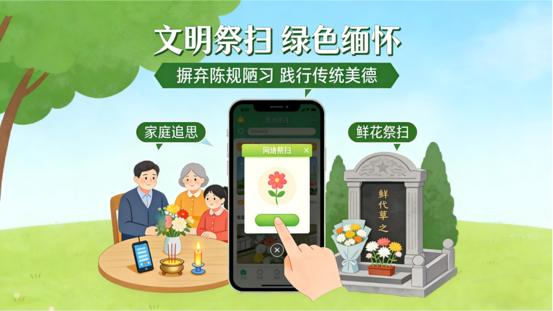 倡导文明祭扫、绿色祭扫,以鲜花祭扫、网络祭扫、家庭追思等简约环保方式缅怀逝者,摒弃铺张浪费、封建迷信等不良习俗;不借祭扫之名搞攀比、讲排场,不组织或参与封建迷信活动,以勤俭节约践行传统美德。